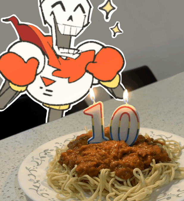 Celebrating UNDERTALE's 10th anniversary with a big big plate of spaghetti! with papyrus!!!!!